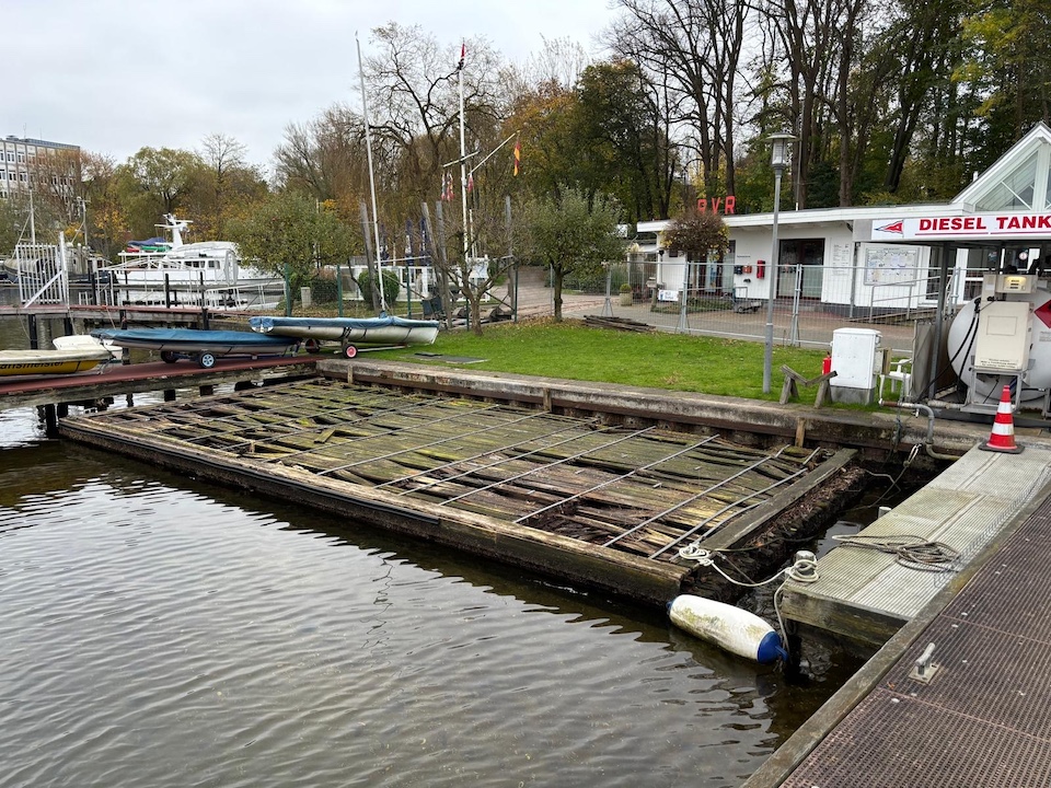 Endlich ist es soweit: Der doch sehr in die Jahre gekommene Holzsteg wurde durch einen neuen Schwimmsteg aus modularen Kunststoff-Schwimmkörpern ersetzt. Die Arbeiten begannen bereits Ende Oktober 2024 und konnten nun endlich abgeschlossen werden. Ganz herzlicher Dank gilt Manfred (Schröder), Ernst, Jürgen, Gastlieger Martin, Andreas und ganz besonders Udo, der auch bei wenig einladenden Temperaturen die unangenehme Arbeit im Wasser übernommen hat. Wieder eine große und wichtige Aufgabe für 2024/25 vom Tisch!