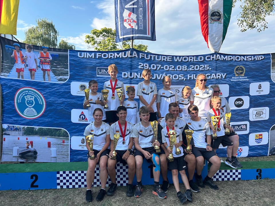 Herzlichen Glückwunsch – wir freuen uns über den grandiosen Erfolg unseres Kooperationspartners JMG (Jugend-Motorboot-Gemeinschaft), der sich als Team Germany bei mehr als 90 Teilnehmern der UIM Formula Future WM im Alter von 6 – 18 Jahren in Dunaújváros/Ungarn, 3 x Gold (Gesamtweltmeister) von 6 möglichen und 1 x Silber sichern konnte, ebenso den Titel „Mannschaftsweltmeister“!